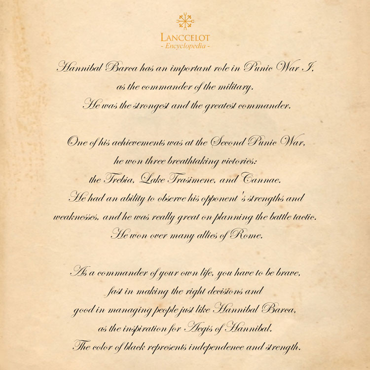 Sebagai pemimpin dalam hidupmu, kamu harus berani dan cepat dalam mengambil tindakan yang tepat, serta handal dalam mengelola manusia sama halnya seperti Hannibal Barca, sebagai inspirasi dari Aegis of Hannibal. Warna hitam dari strap kulit melambangkan kemandirian dan kekuatan.