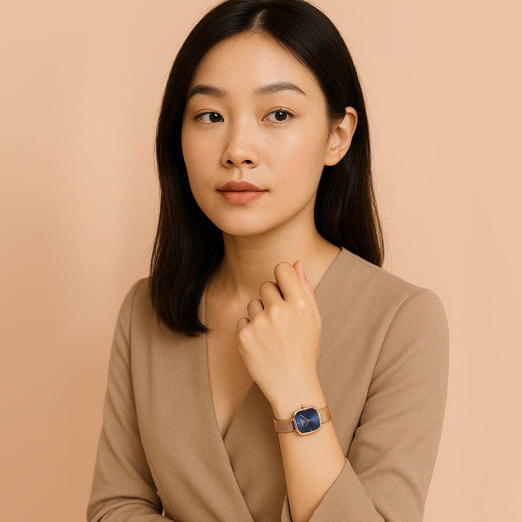 Case berwarna rosegold memberikan sentuhan mewah dan feminin, menghadirkan kesan hangat dan anggun di setiap gerakan tangan. Sementara itu, dial berwarna navy menambah kedalaman visual yang tenang, menciptakan kontras yang memikat antara kelembutan rosegold dan ketegasan warna biru tua. Perpaduan ini mencerminkan karakter wanita modern: lembut namun kuat, berani namun tetap elegan.