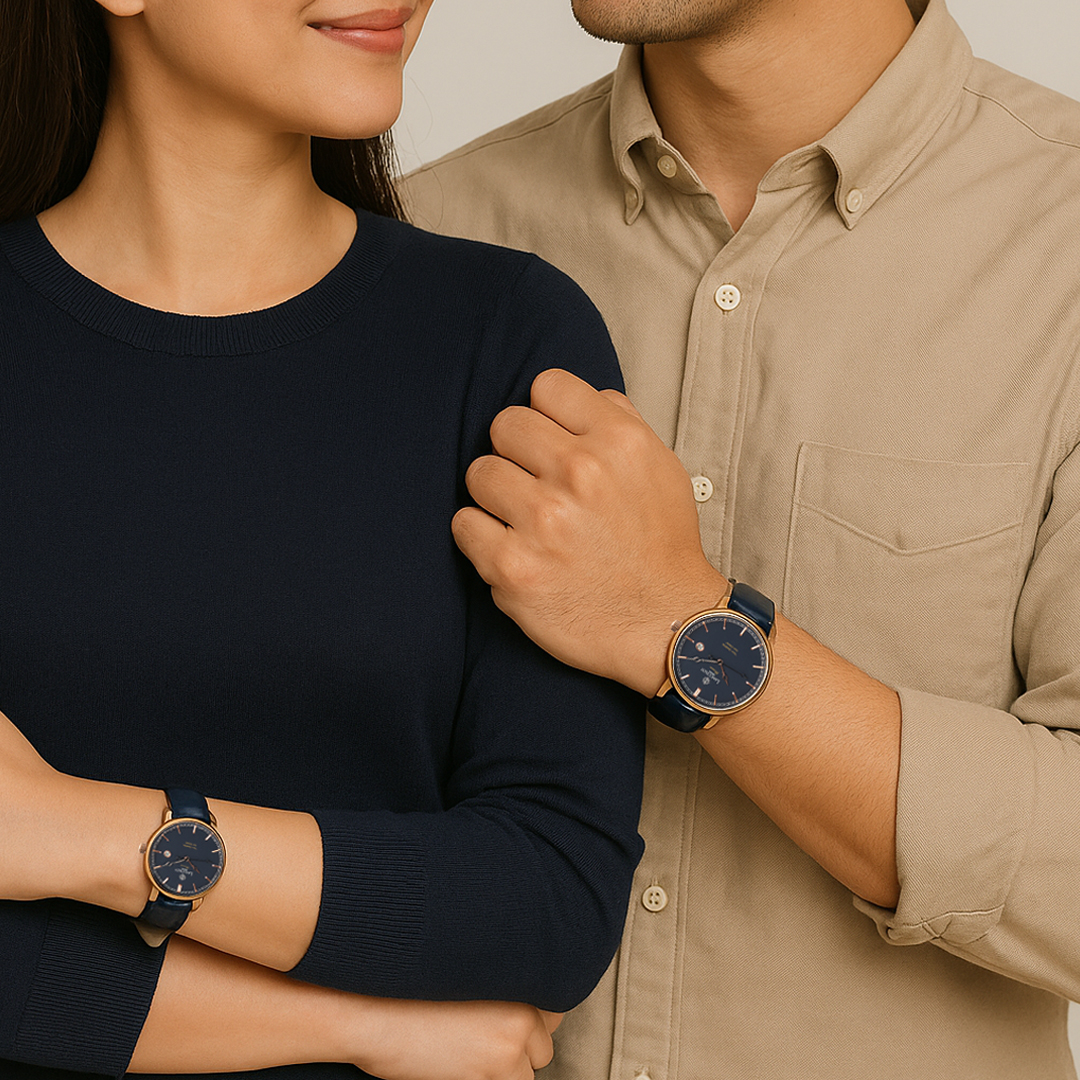 Design case rosegold yang elegan mencerminkan kemewahan dan wibawa, sementara strap berwarna navy menghadirkan nuansa tenang, berkelas, dan cocok untuk berbagai acara.
