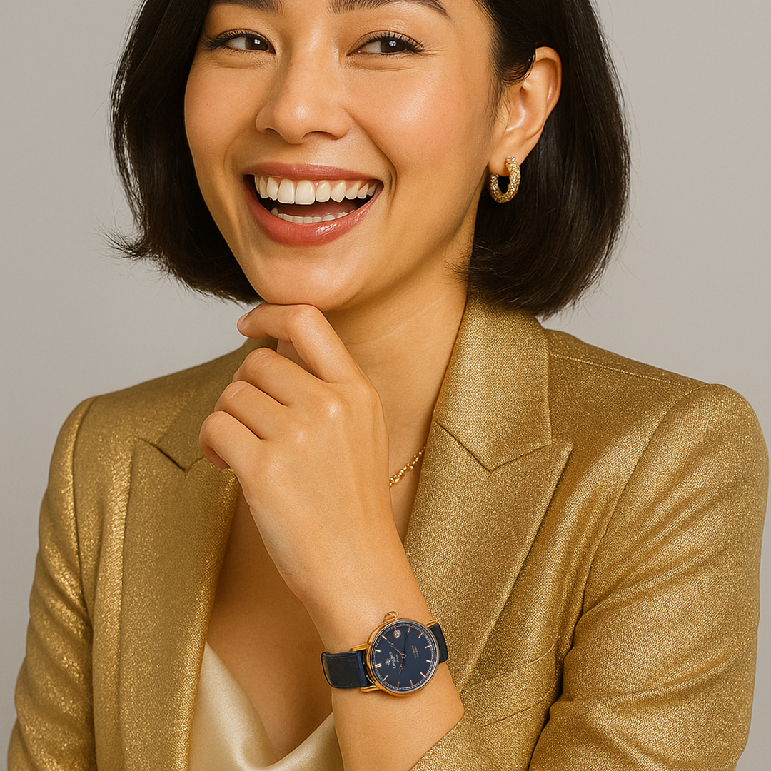 Design case rosegold yang elegan mencerminkan kemewahan dan wibawa, sementara strap berwarna navy menghadirkan nuansa tenang, berkelas, dan cocok untuk berbagai acara.