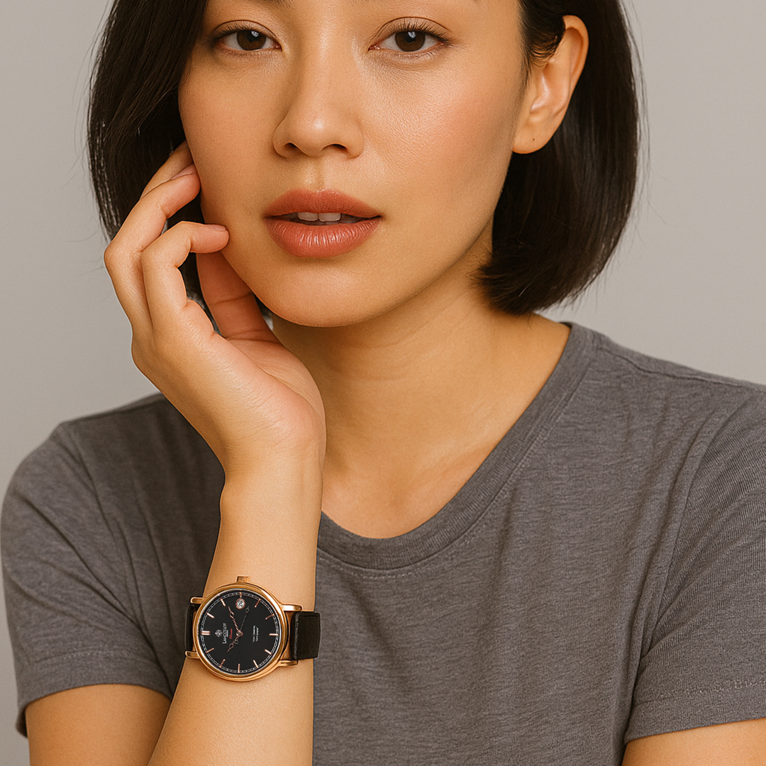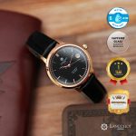 Warna hitam pada dial dan strap menghadirkan kesan maskulin, misterius, dan berwibawa, sementara sentuhan rosegold pada case memberikan nuansa mewah dan hangat tanpa terkesan berlebihan. Kombinasi ini membuat jam tangan ini cocok digunakan dalam berbagai suasana baik formal maupun kasual.