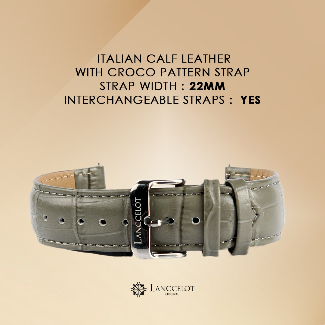 A stylish 22mm strap with an elegant crocodile-textured grey finish and a silver buckle. Crafted for both comfort and durability, it brings a refined and classic touch to any timepiece, perfect for formal or casual occasions.