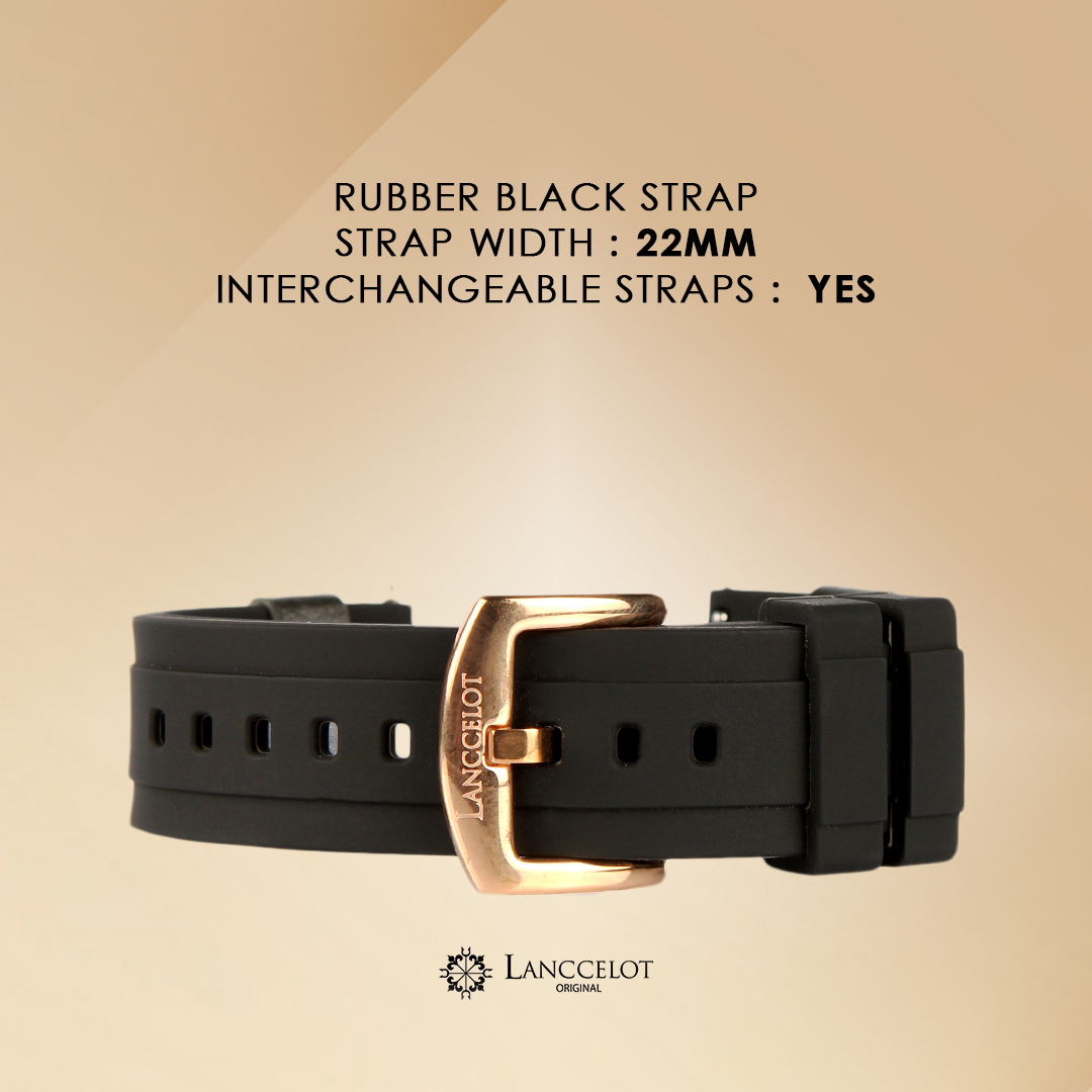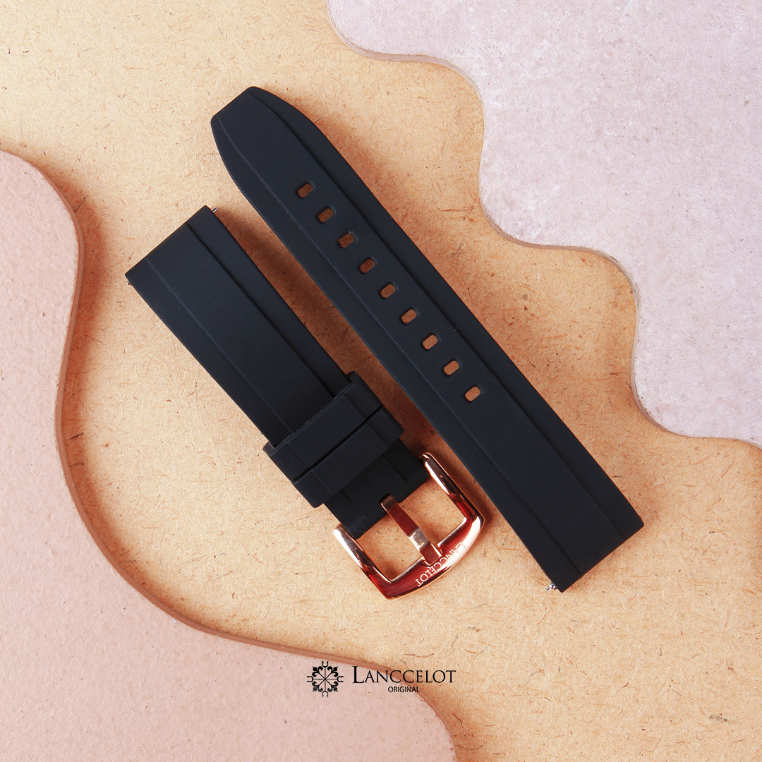 A premium 22mm black rubber strap featuring a sleek gold buckle. It offers a comfortable, flexible, and water-resistant design, perfect for both daily wear and sports activities. The minimalist yet modern look adds a sporty and professional touch to your watch.